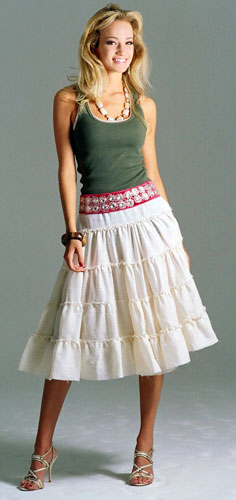 Now a day’s skirts are made up using light fabrics, such as denim, worsted, poplin etc. These light thin skirts are usually worn with slips. The length of the skirt can be as long as it touches the ground or can be short up to thigh. This factor totally depends upon the fashion or on the personal taste of the woman.